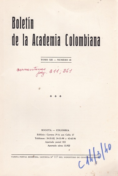 in Boletín de la Academia Colombiana > Tomo XII, N°45, 1962 (oct.- dic.) . - pp. 361-369